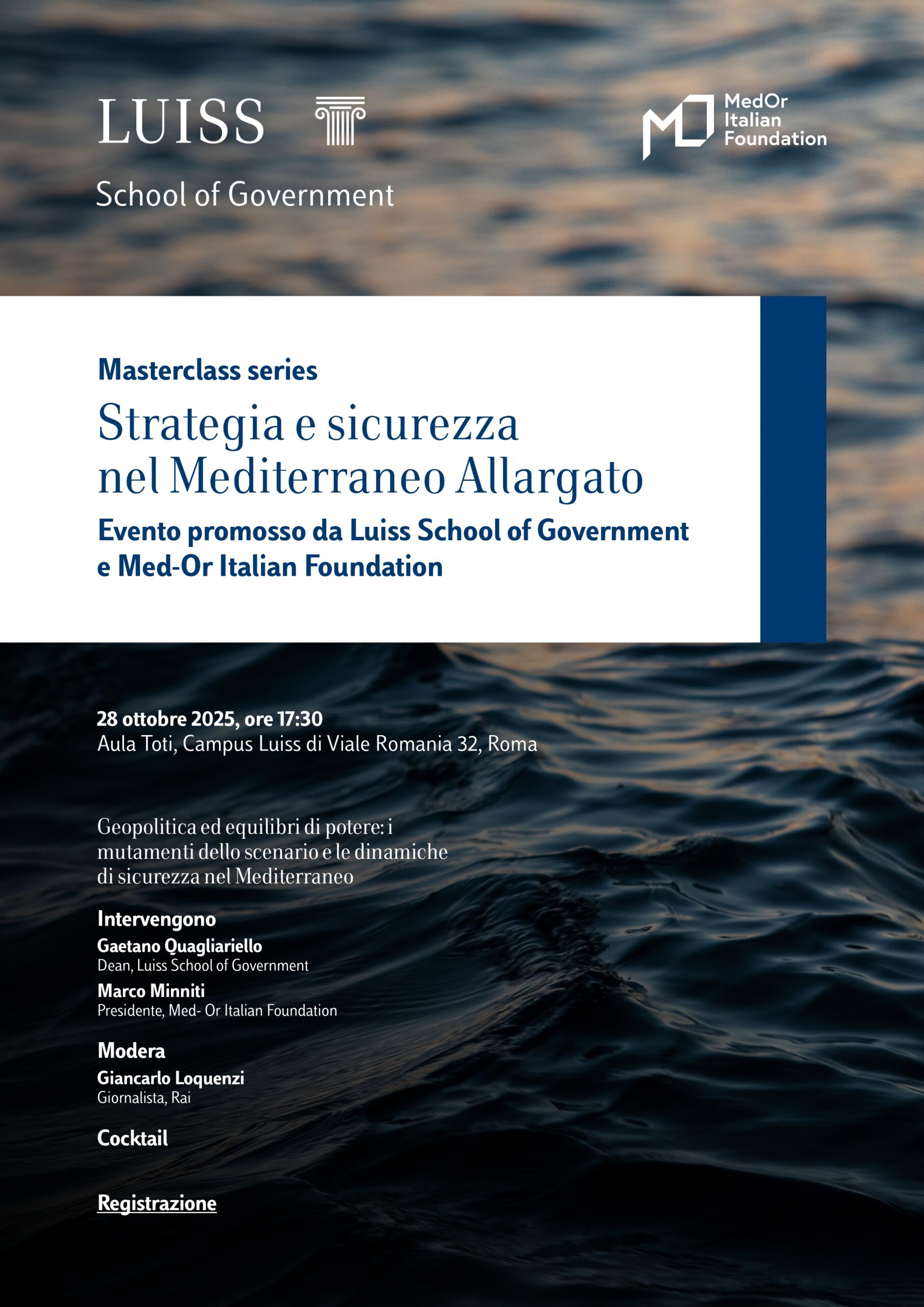 L’incontro, dedicato a “Geopolitica ed equilibri di potere: i mutamenti dello scenario e le dinamiche di sicurezza nel Mediterraneo”, vedrà gli interventi di Gaetano Quagliariello, Dean della Luiss School of Government, e di Marco Minniti, Presidente della Med-Or Italian Foundation. A moderare sarà il giornalista Giancarlo Loquenzi (Rai).